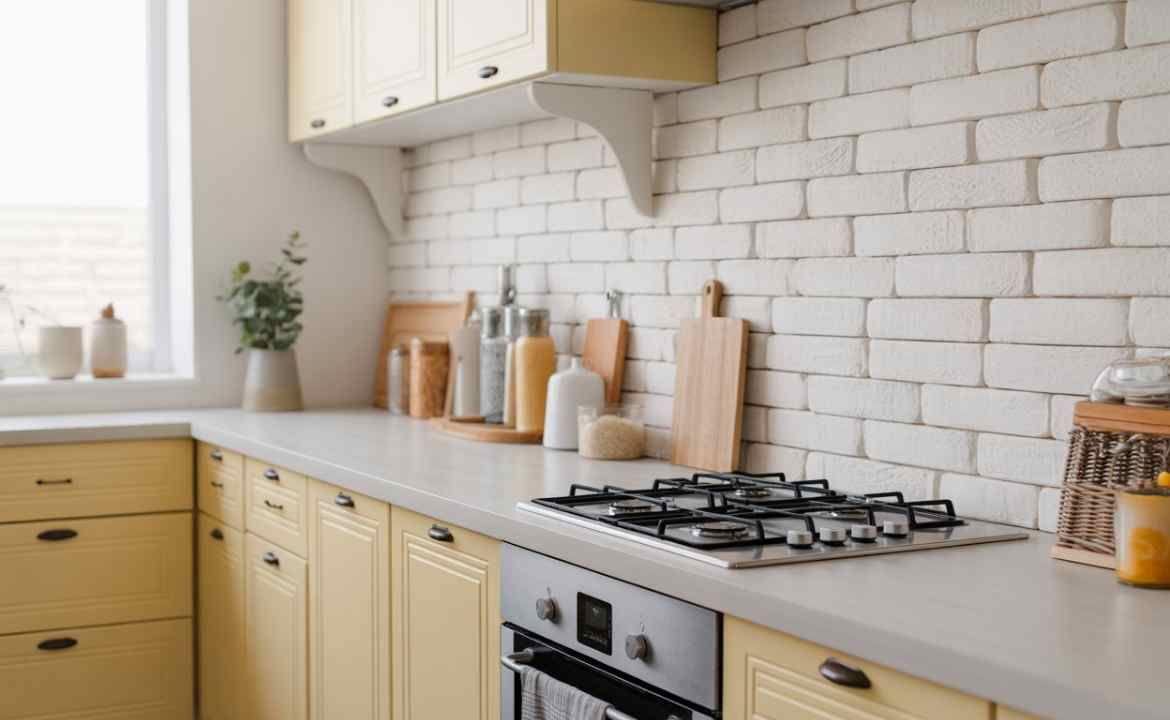 For this, you will need a form of latex paint, water, a rag or brush, and a sealer. Also, keep old towels around for quick wipe-downs, as this is what most people try as a DIY kitchen improvement, especially if brick is already installed. The sealer is to protect it from splashes in the cooking area.